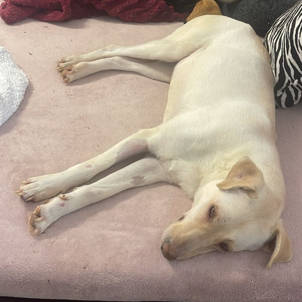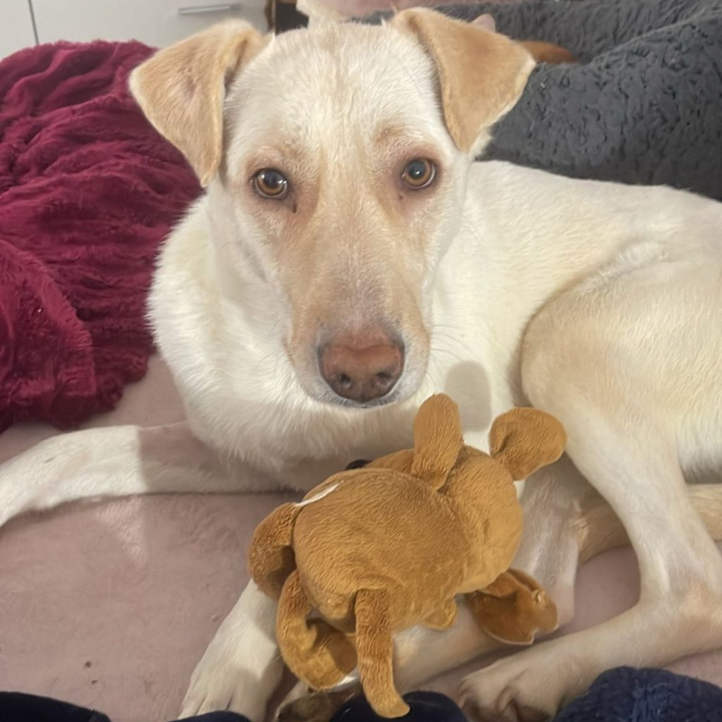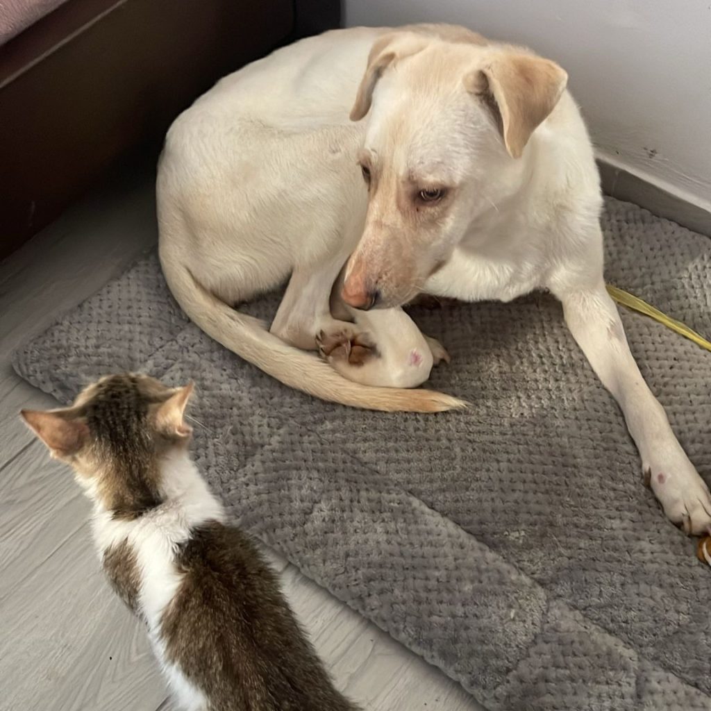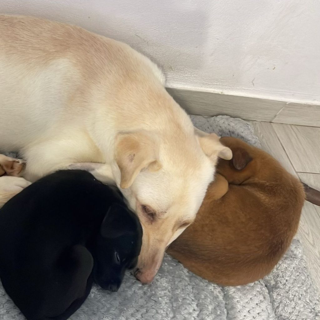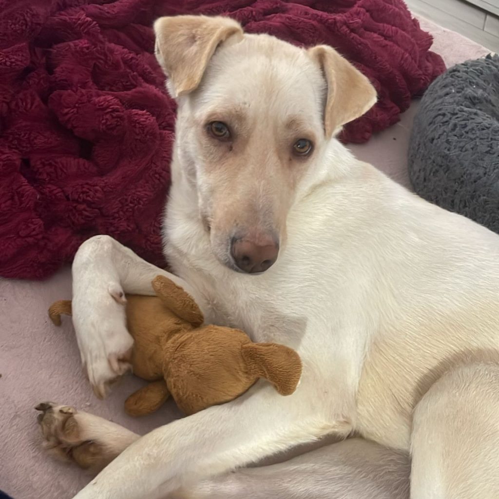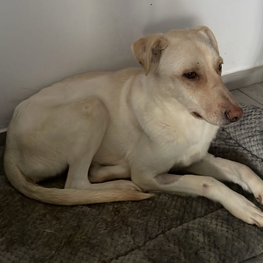 Camilla ist eine unwahrscheinlich sanfte Hündin – sie ist voller Dankbarkeit, aus der Tötung gerettet worden zu sein. Da sie so sanft ist, hatte sie keine Chance – man muss dort um das wenige Futter kämpfen, schnell sein und auch mal drängeln – aber so ist sie nicht. Wir denken, dass sie davor ein Zuhause hatte und leider ausgesetzt wurde. Bei der Tierschützerin hatte sie ihren Platz auf dem Boden im Schlafzimmer. Die ersten Tage nach ihrer Rettung hat sie nur geschlafen und im Liegen gefressen, sie war einfach zu schwach. In den letzten Wochen hat sie sich sehr gut erholt und kam wieder zu Kräften. Seit ein paar Tagen hat sie entdeckt, dass es auch ganz toll ist, auf dem Bett zu liegen 🙂 Wir freuen uns sehr über diese Entwicklung. Camilla ist mit allen Hunden dort sehr gut verträglich, die Welpen kommen gerne zu ihr zum Kuscheln – auch bei Katzen ist sie ganz entspannt.