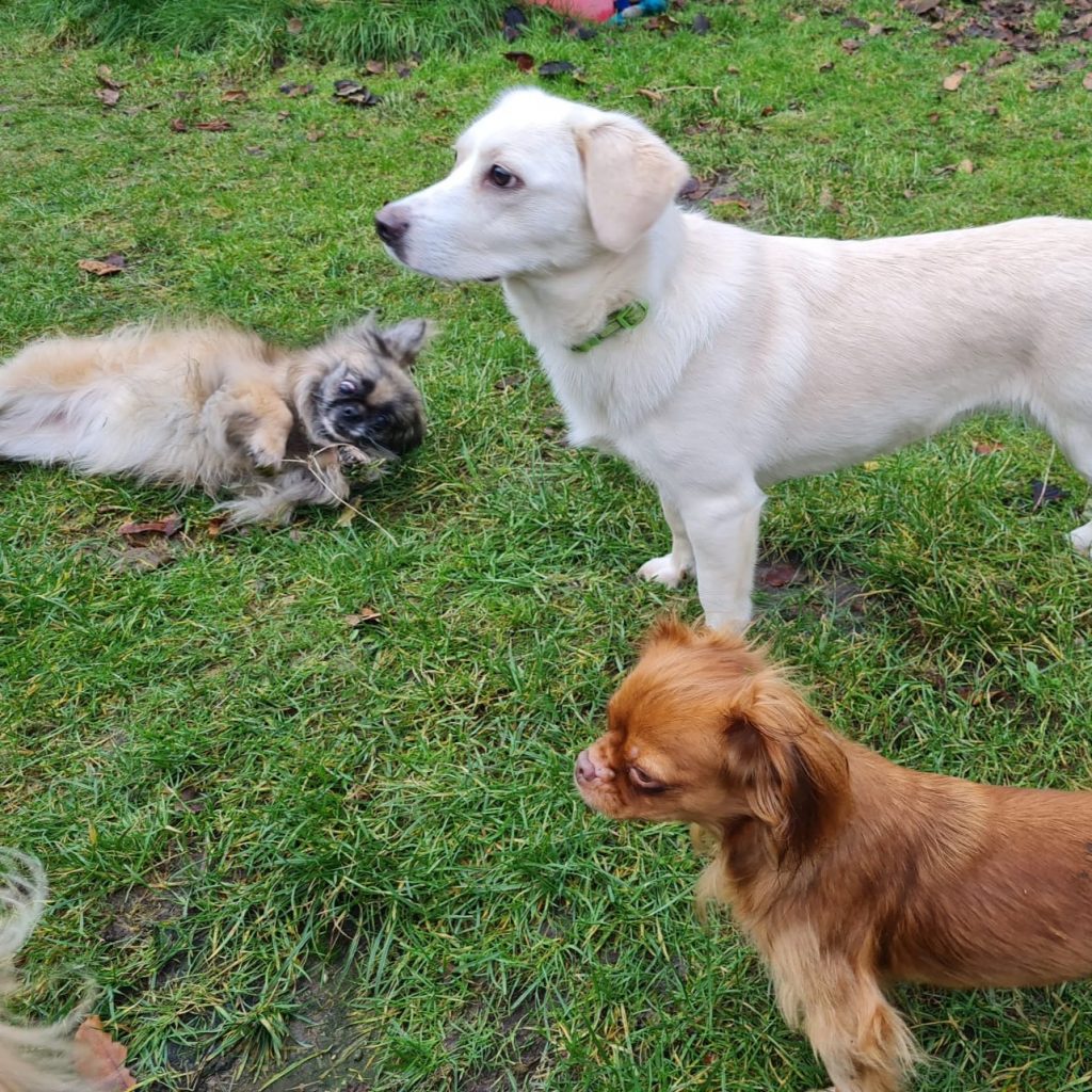 Dolly ist eine ganz liebe und freundliche Hündin, die in den letzten Wochen in der Pflegestelle richtig aufgetaut ist. Wenn sie die Menschen gut kennt, ist sie ihnen gegenüber aufgeschlossen und zugewandt, wie bei ihren Pflegeeltern, sie liebt es gekrault zu werden und zu kuscheln. Bei fremden Menschen braucht sie eine Weile um Vertrauen zu fassen. Mit dem Pflegestellenrudel war sie sofort sehr gut verträglich und liebt es mit ihnen zu spielen und durch den Garten zu toben.