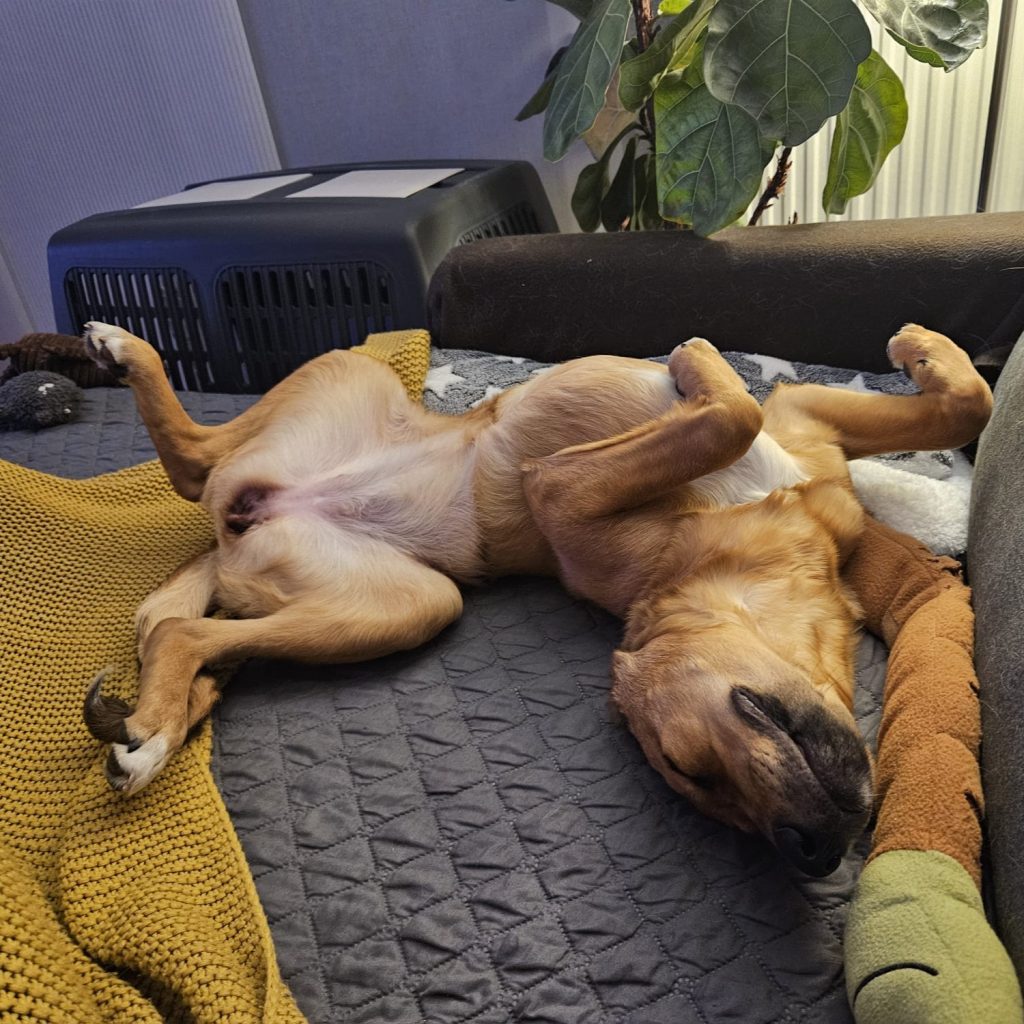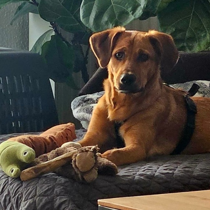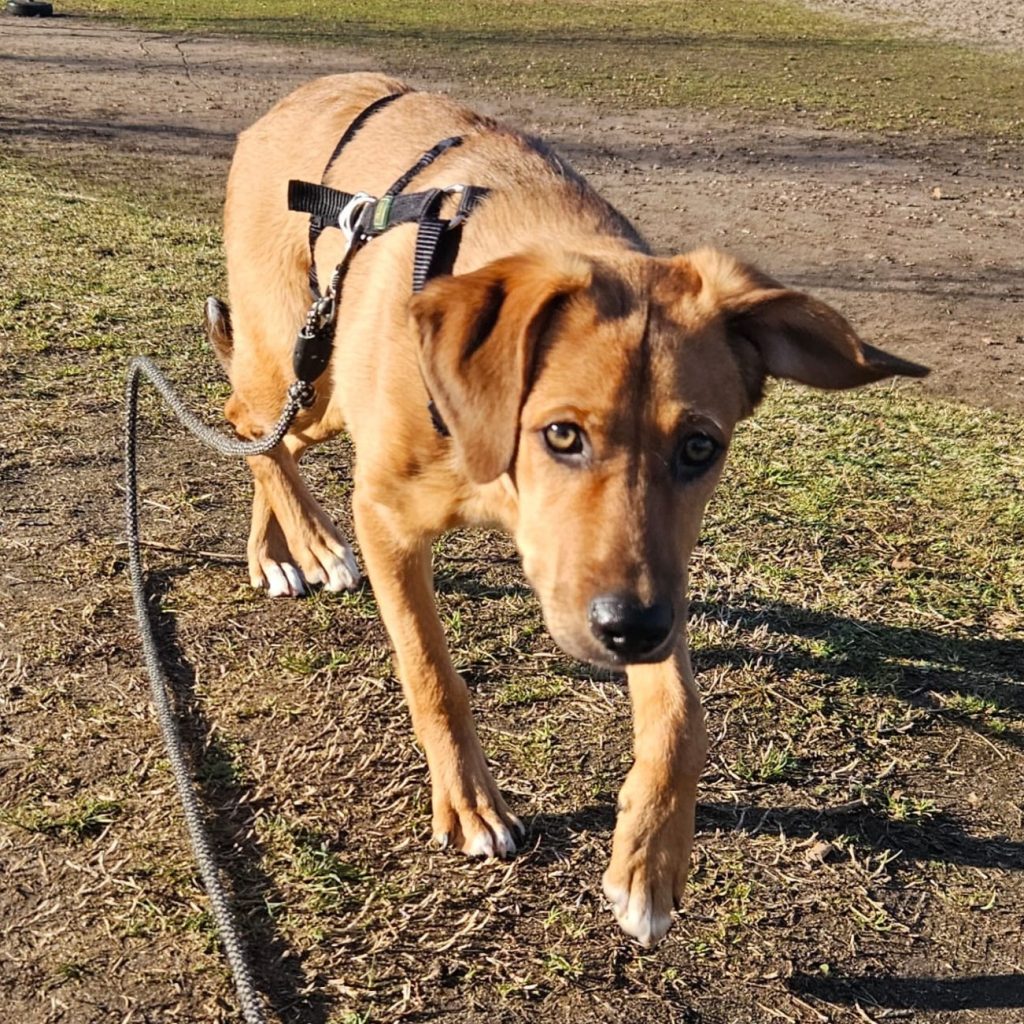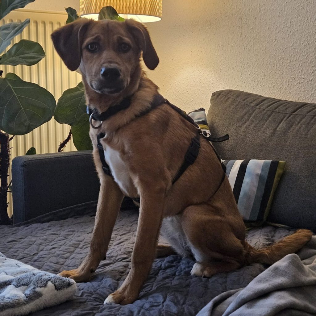 Jarah ist gerne draußen, geht gut an der Leine und lässt sich problemlos das Geschirr anziehen. Sie liebt andere Hunde und würde gerne mit jedem spielen, der ihr begegnet. Sie kann auch ganz toll alleine mit ihrem Spielzeug spielen, sich gut beschäftigen und kommt im Haus gut zur Ruhe. Die Familie trainiert gerade in kleinen Schritten das alleine bleiben, Jarah macht das gut und schafft schon kurze Zeiten ganz entspannt – Jarah lebt dort als einzige Hündin, sie ist dann wirklich ganz alleine. Sie kennt es im Auto mitzufahren und ist größtenteils stubenrein. In der kurzen Zeit, die sie da ist, hat sie schon so viel gelernt und entdeckt jeden Tag voller Mut neue Dinge.